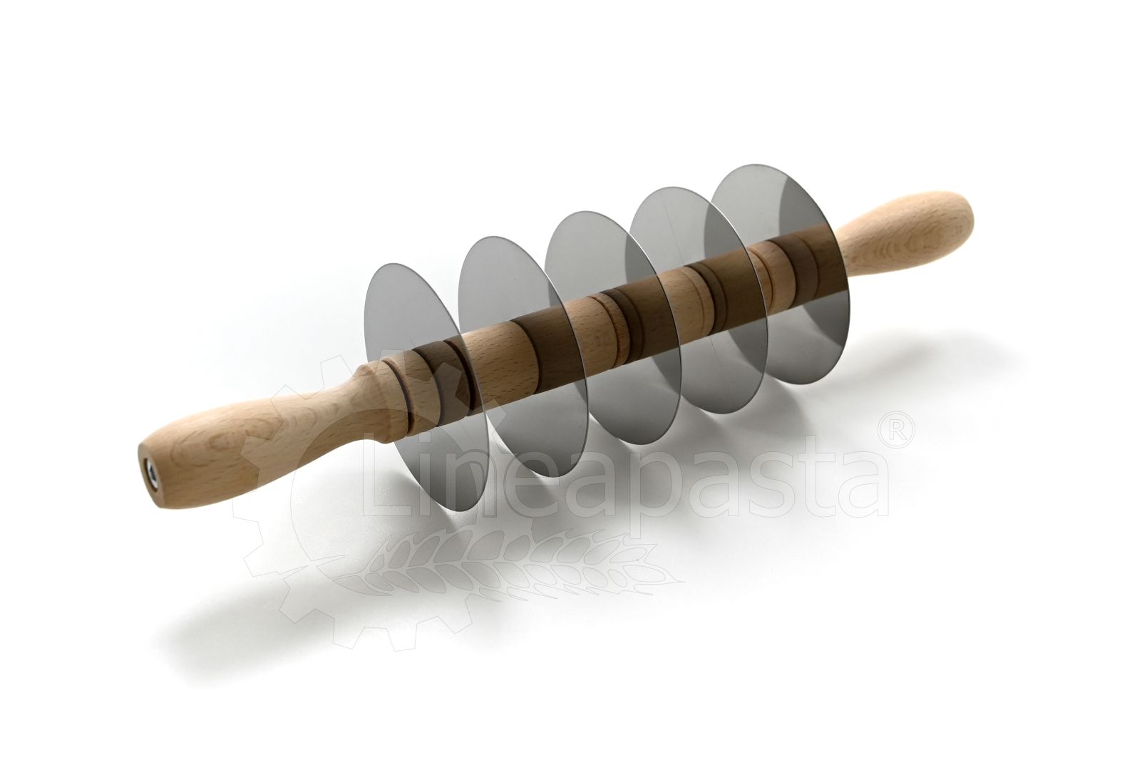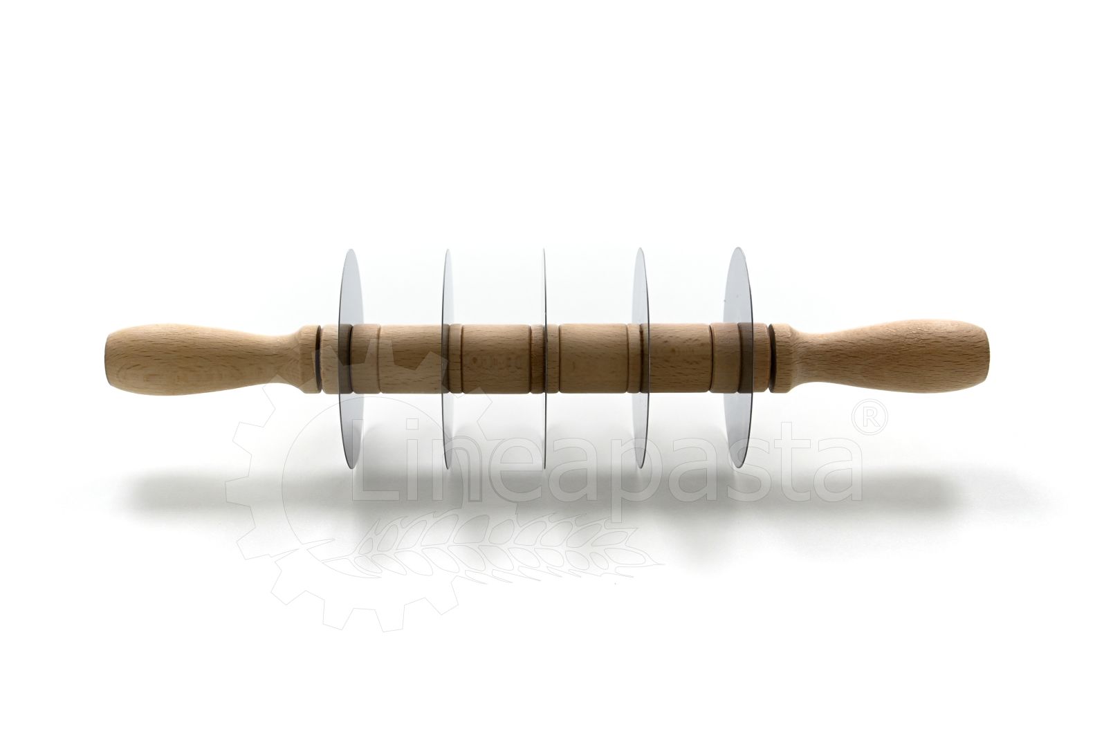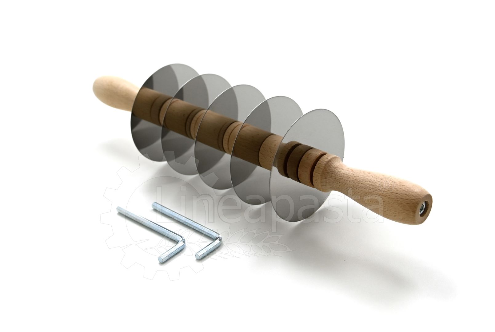 Rouleau coupe-pâte en bois et acier équipé de cinq lames lisses en acier inoxydable de 88 mm avec des poignées en bois confortables. Ce rouleau coupe-pâte, adapté aussi bien à un usage professionnel que domestique, permet de modifier la distance entre les lames pour jusqu'à six combinaisons de coupe différentes. Deux clés allen sont fournies avec le produit qui permettent de dévisser la tige du rouleau et de modifier les largeurs de coupe pour la production de tagliatelles, tortelloni et tortellini. Le rouleau coupe-pâte comprend: quatre entretoises de 6 mm, quatre entretoises de 11 mm et quatre entretoises de 27 mm.