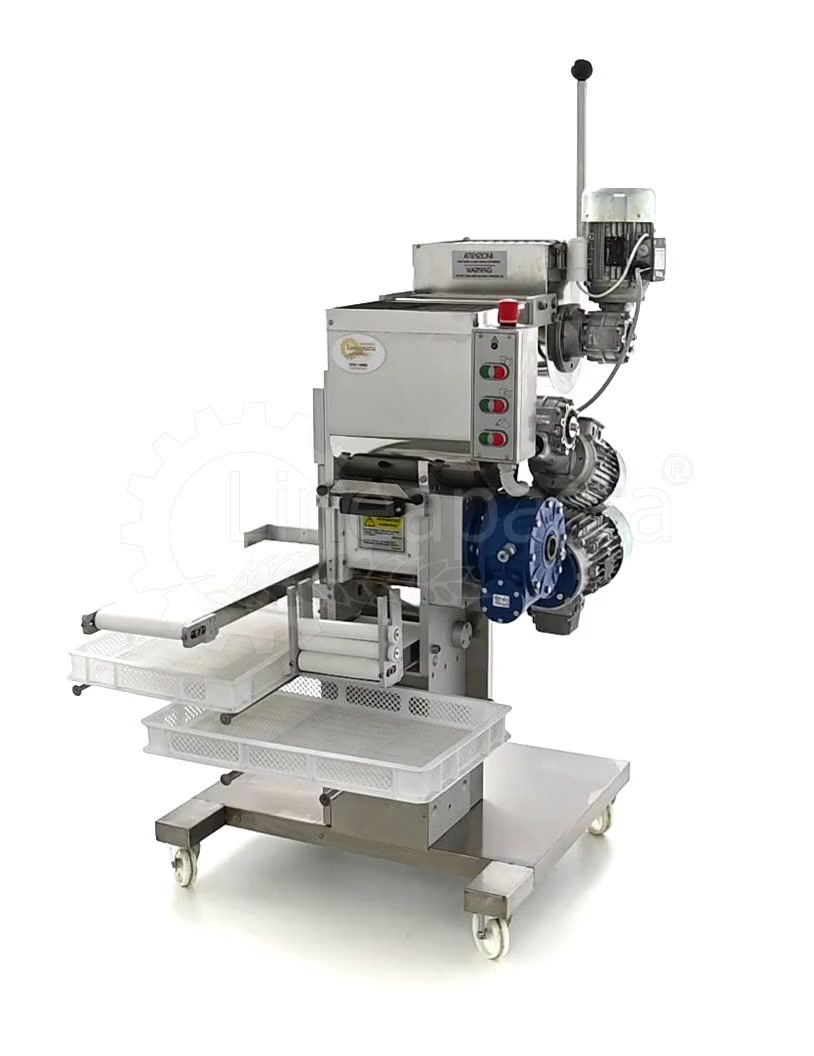 Gruppo Ravioli 170mm: consente di preparare dei perfetti ravioli a doppia sfoglia. Il Gruppo Ravioli ha lo stampo fisso integrato nella macchina ed una volta scelto il formato di produzione (mm 20X20, 34x40, 40x50, 70x70x70), questo non potrà più essere cambiato se non acquistando un nuovo Gruppo Ravioli.
