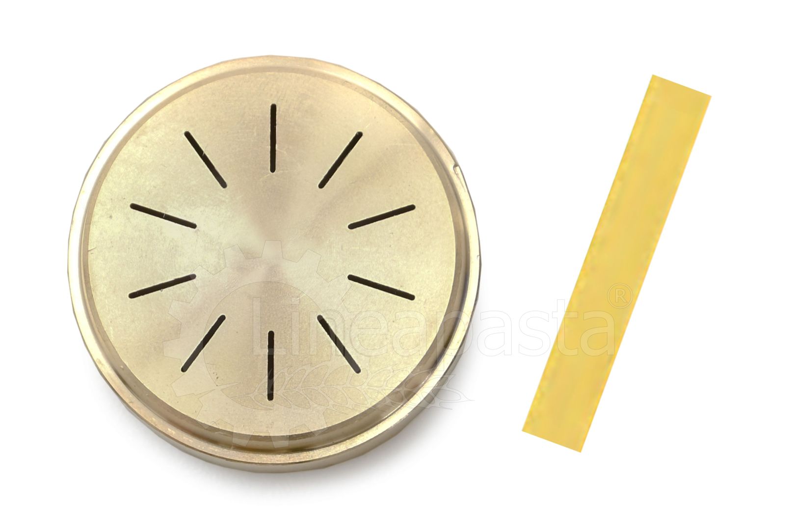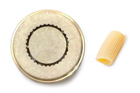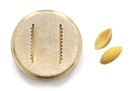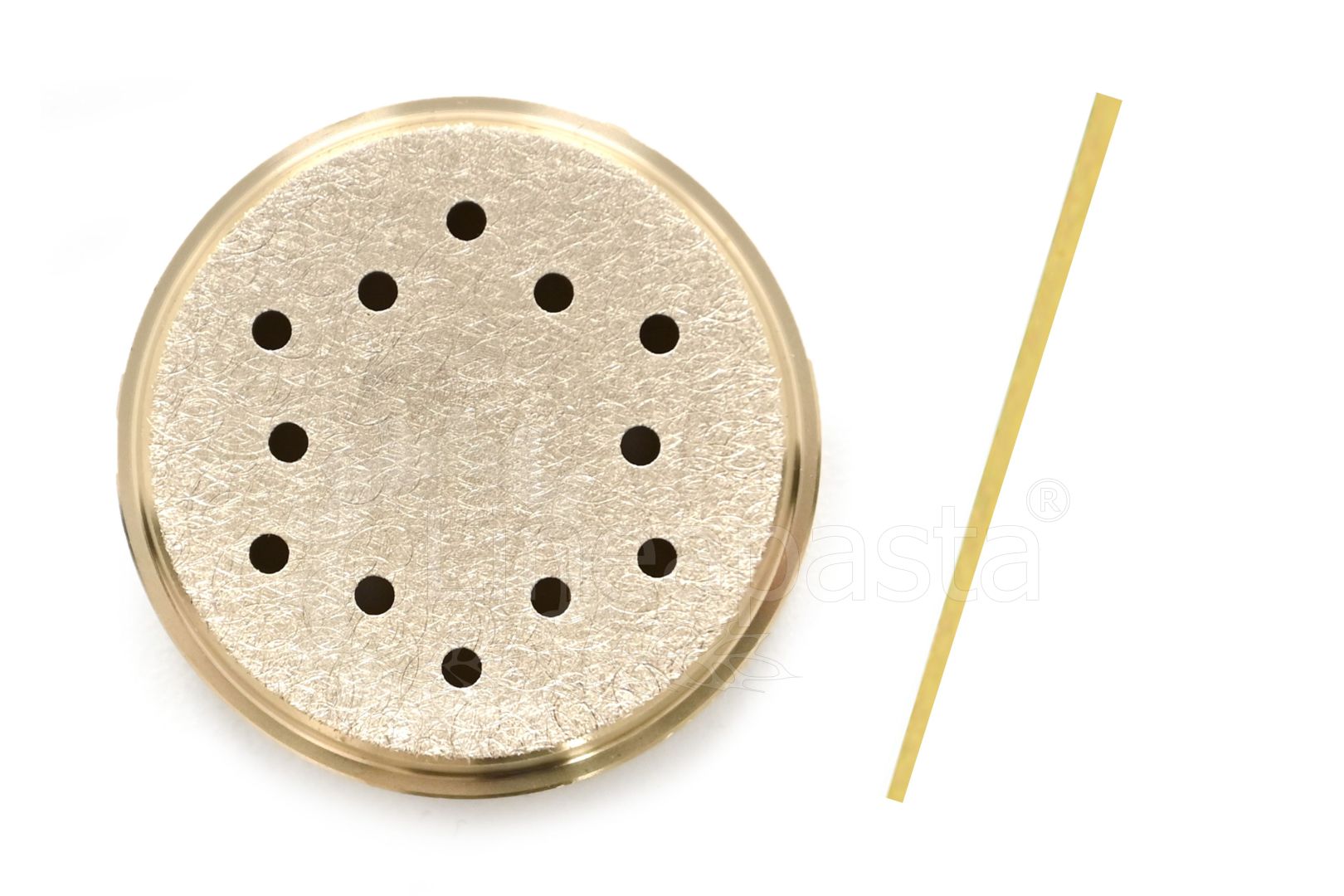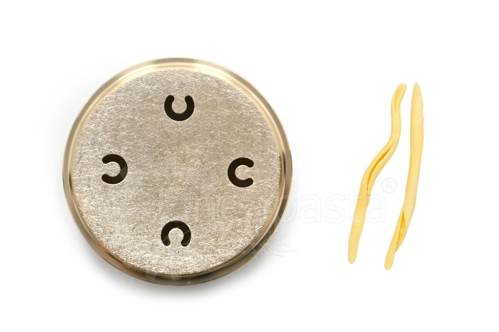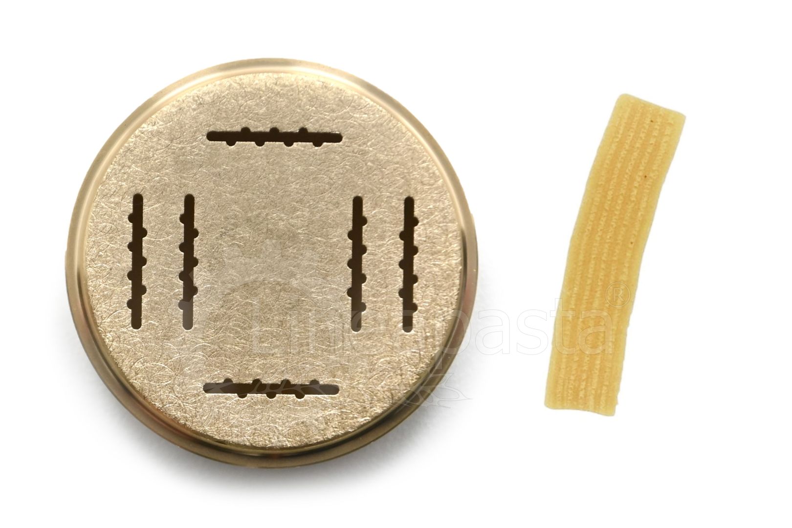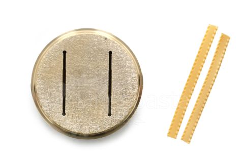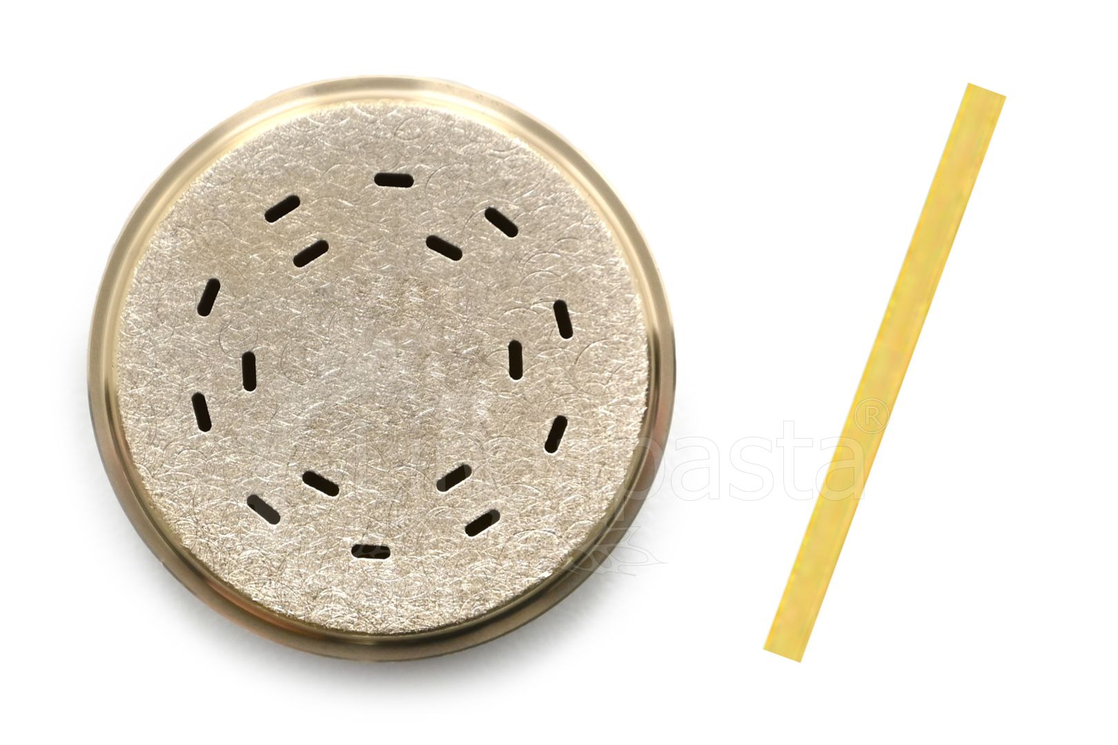 Pasta sfoglia 130 mm con spessore regolabile - Pasta sfoglia 105x0,6 mm / 105x0,8 mm / 105x1,2 mm - Biscotti - Bucatini Ø3,6x1,1 mm - Calamarata Ø28x1,5 mm - Canestroni rigati Ø26 mm - Cannelloni Ø28x0,8 mm - Caserecce 9 mm - Cavatelli 24x1 mm - Chicche di patate Ø13 mm - Conchigliette da brodo 13 mm - Conchigliette rigate 18 mm - Conchiglie rigate 32,5 mm - Fiocco di neve 27 mm - Fusilli 3P 6,5 mm / 10 mm - Fusilli calabresi 5,4x1,4 mm - Fusilli rigati 3P 10 mm - Fusilloni giganti 16,5 mm - Gnocchi 24,5 mm - Gnocchi napoletani 26 mm - Gnocchi sardi 24x1 mm - Gramigna Ø3,5 mm - Grissini Ø6 mm / Ø11 mm - Grissini POM Ø6 mm / Ø12 mm - Linguine 3,6x1,5 mm - Linguine rigate 5x2,1 mm - Maccheroni siciliani 7x2 mm - Maccheroni bugiardi Ø11 mm - Mafalde 25,5 mm - Mafaldine 18 mm - Malloreddus 25x1,1 mm - Mezze maniche rigate Ø20 mm - Occhi di lupo rigati Ø15,5 mm - Orecchiette grandi 22 mm - Paccheri lisci Ø25x1,5 mm - Paccheri rigati Ø25x1,5 mm - Pappardelle 14,5x0,6 mm / 14,5x1,15 mm / 20x0,8 mm / 20x1 mm - Pappardelle rigate 14,7 mm - Passatelli Ø7 mm - Penne rigate 10 mm (solo taglio a mano) - Pici toscani Ø4,2 mm - Pizzoccheri 8,5x2 mm - Radiatori 19 mm / 26 mm - Ricciolo 13,5 mm - Rigatoni Ø12x1,1 mm - Rotini 2P 10,8 mm - Ruote a fiore Ø25 mm - Ruote rigate Ø13 mm - Scialatielli 5x3 mm / 5,6x3,6 mm - Sedanini rigati Ø6,5 mm / Ø8,5 mm - Spaghetti alla chitarra 2x2 mm / 2,5x2,5 mm / 3,2x3,2 mm / 4x4 mm - Spaghetti Ø2,5 mm - Spaghettoni Ø3,2 mm - Tagliatelle 6x0,6 mm / 6x0,8 mm / 6x1 mm / 7x1,3 mm / 8x0,6 mm / 8x0,8 mm / 8x1 mm - Tagliolini 3x1 mm - Torchietti 9x1,1 mm - Treccia 8,5 mm - Tripoline 10,8 mm - Ziti lisci Ø7,3x1,15 mm