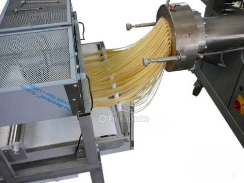Il nastro trasportatore viene posizionato a ridosso del cilindro di estrusione della macchina per pasta, e gli spaghetti o qualsiasi altra pasta lunga viene trasportata alla stessa velocità di estrusione della macchina verso il gruppo di taglio dove viene poi tagliata. Grazie al potenziometro è possibile scegliere il tempo di taglio e la velocità del nastro trasportatore in modo da adattarlo alla velocità di estrusione della pressa.