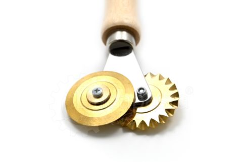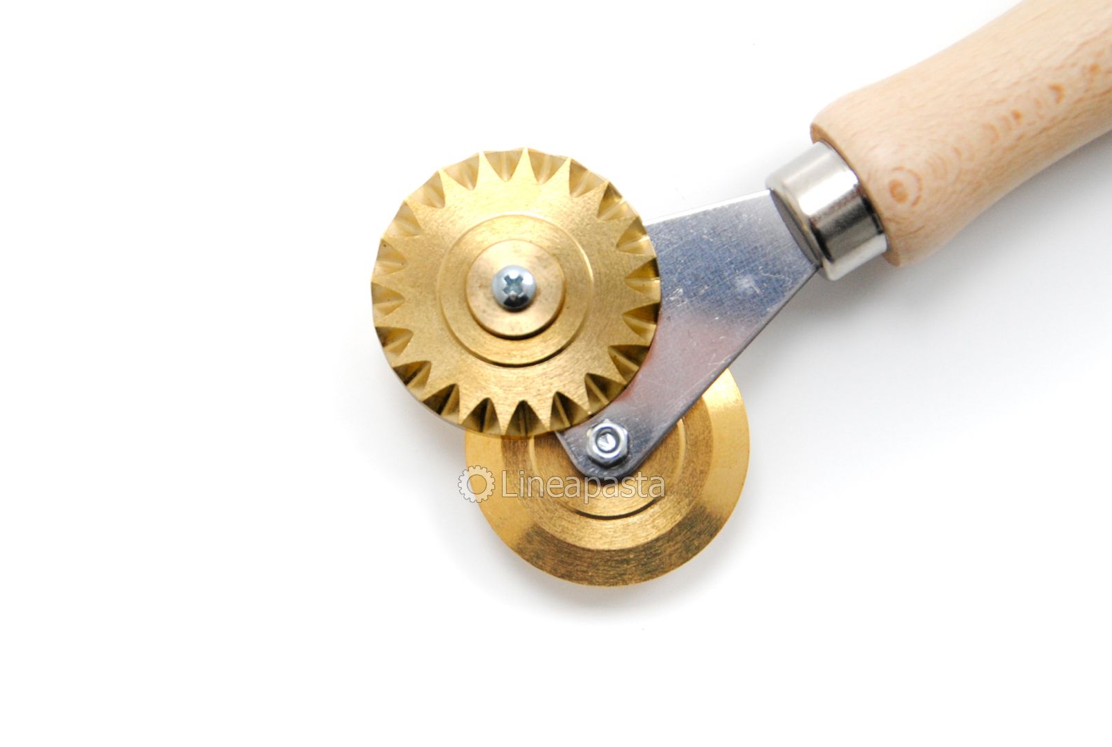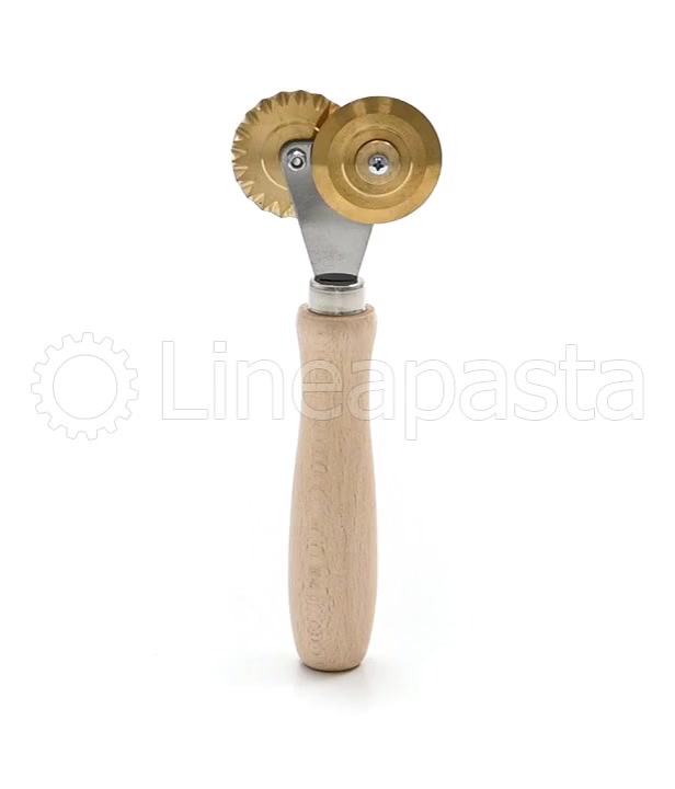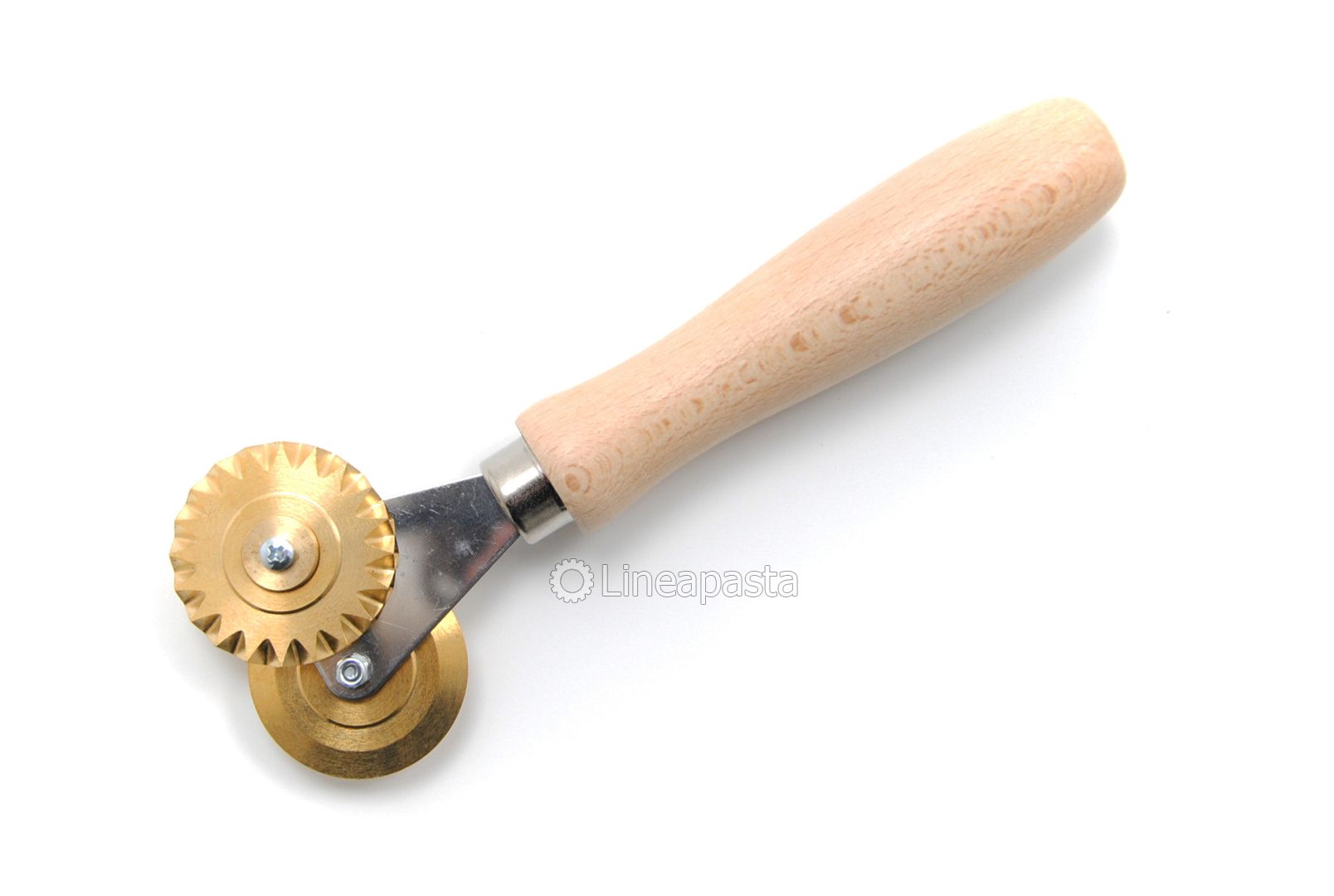 Tagliapasta a doppia rotella robusto e maneggevole realizzato in ottone. Questo modello di tagliapasta in particolare è composto da un manico in legno e un supporto in acciaio, a cui sono fissate una lama liscia e una lama dentata di 38 mm in ottone, in modo da avere due tipi di taglio diversi in un unico strumento. Ideale sia per uso domestico che professionale, lo strumento permette un taglio netto e preciso della sfoglia.