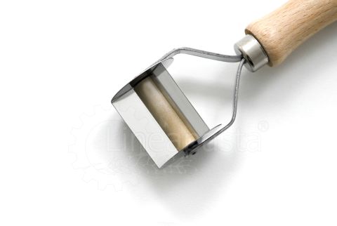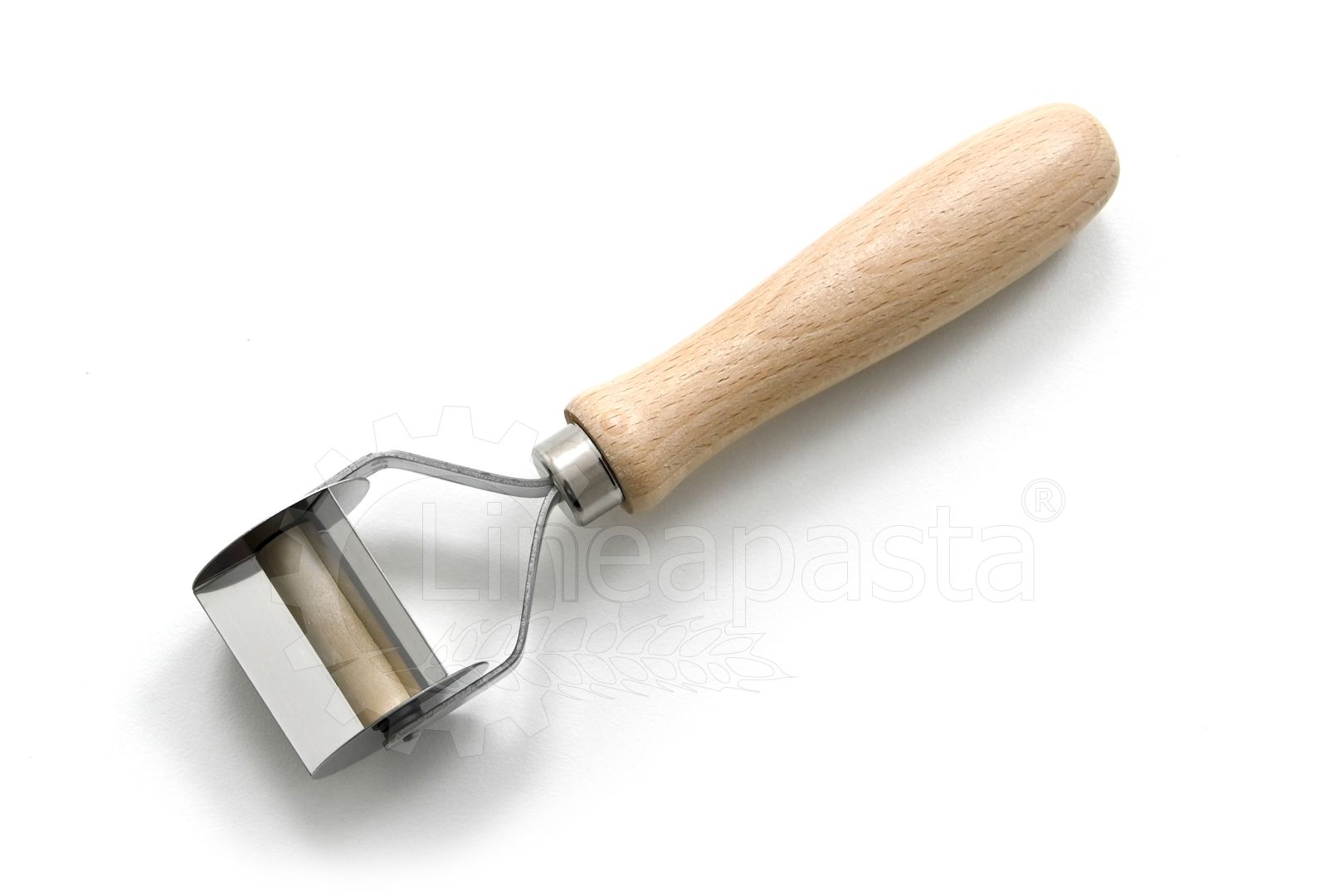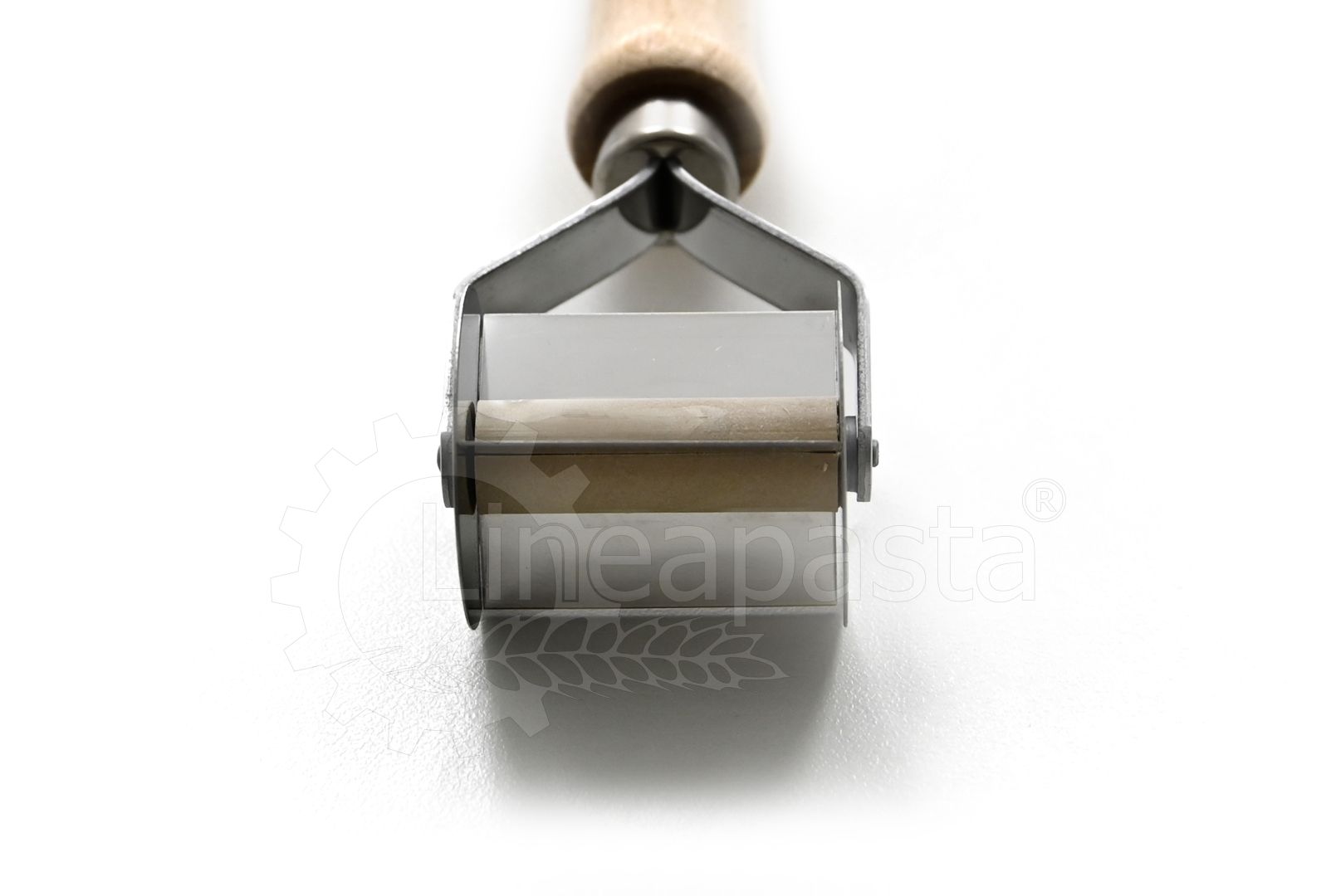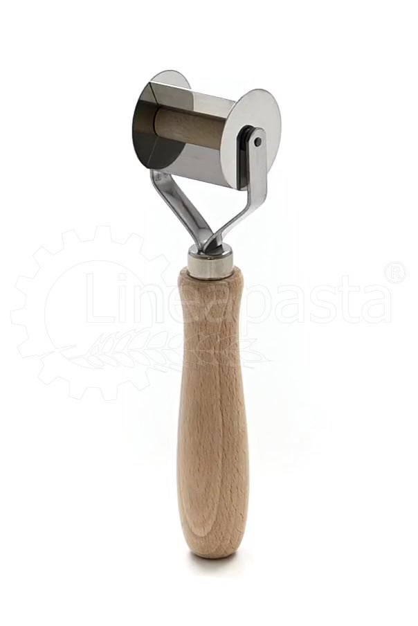 Tagliapasta fornito di due lame lisce in acciaio inox distanti 38 mm l'una dall'altra, con lame perpendicolari alle rotelle che permettono di tagliare la sfoglia in tre quadrati ad ogni giro. Questo taglia pasta è dotato di un comodo manico in legno di faggio. Questo strumento è progettato per produrre cappelletti, ravioli e tortellini.