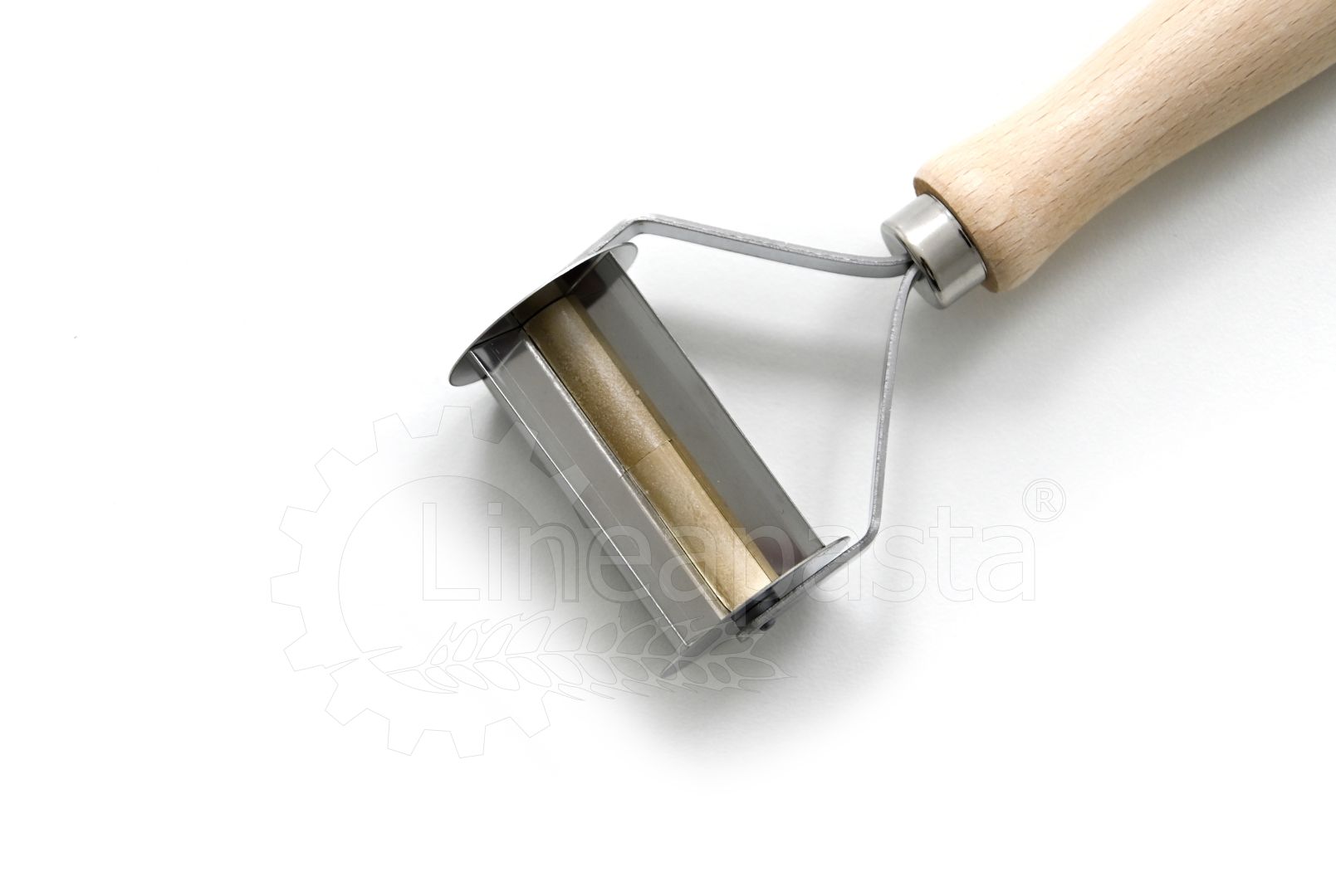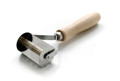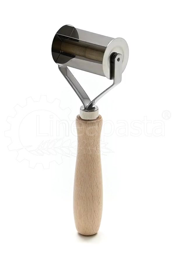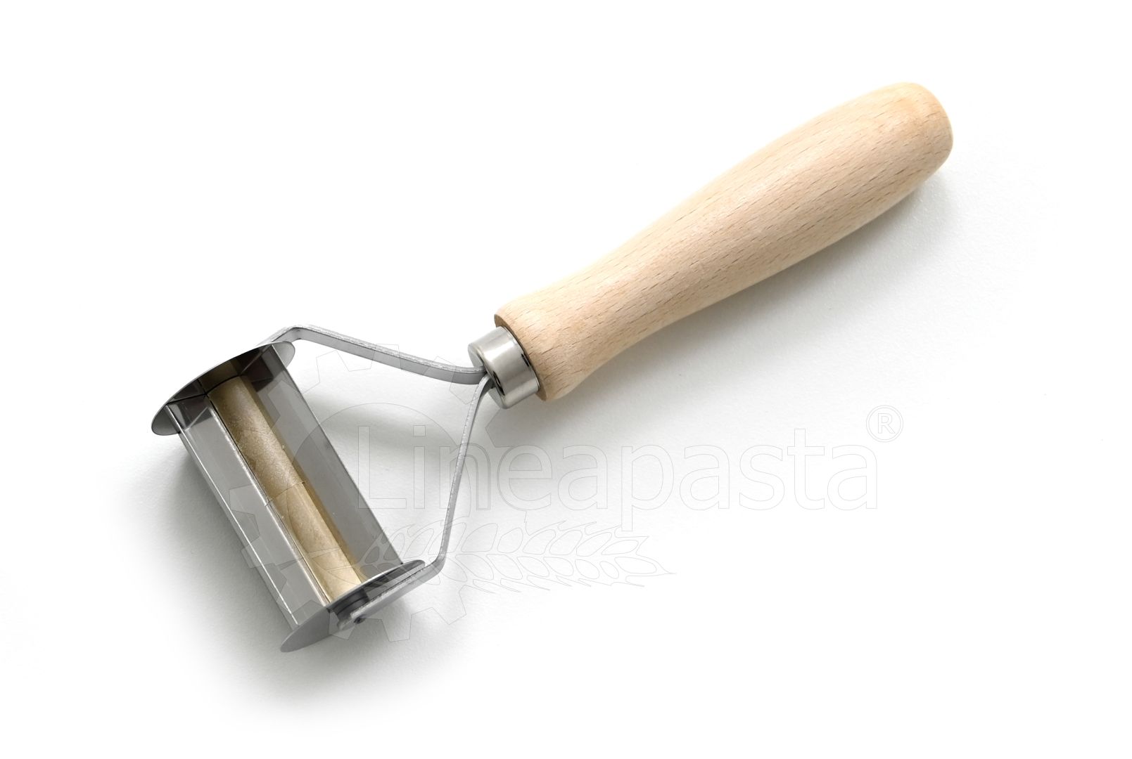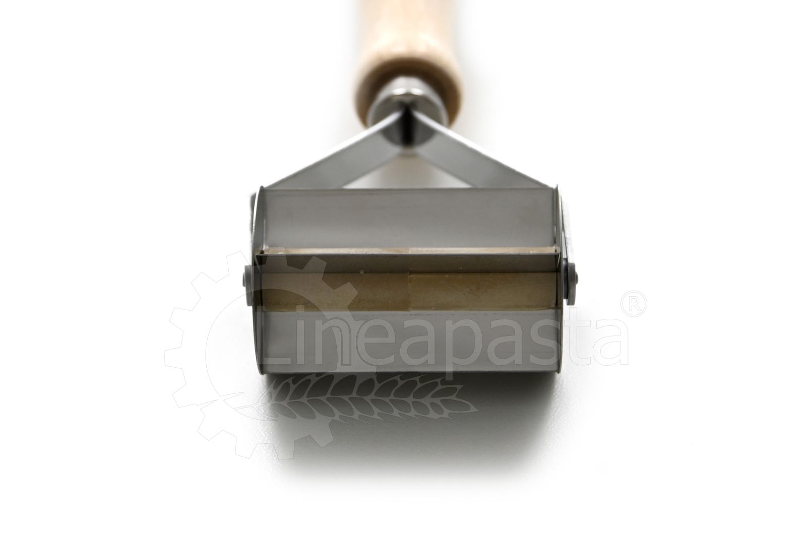 Tagliapasta composto da un pratico manico in legno e due lame lisce in acciaio inox, poste a una distanza di 56 mm e sono dotate di lame perpendicolari alle rotelle che consentono di tagliare la pasta sfoglia in quattro rettangoli da 28x56 mm ad ogni giro. Questo utensile è adatto sia per uso domestico che professionale, pensato per la produzione di tortellini, cappelletti e ravioli.