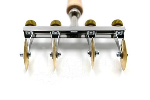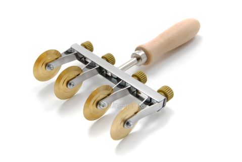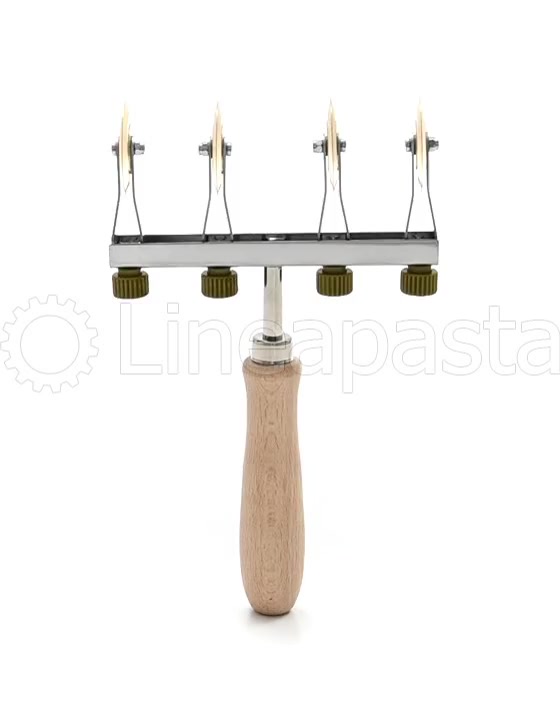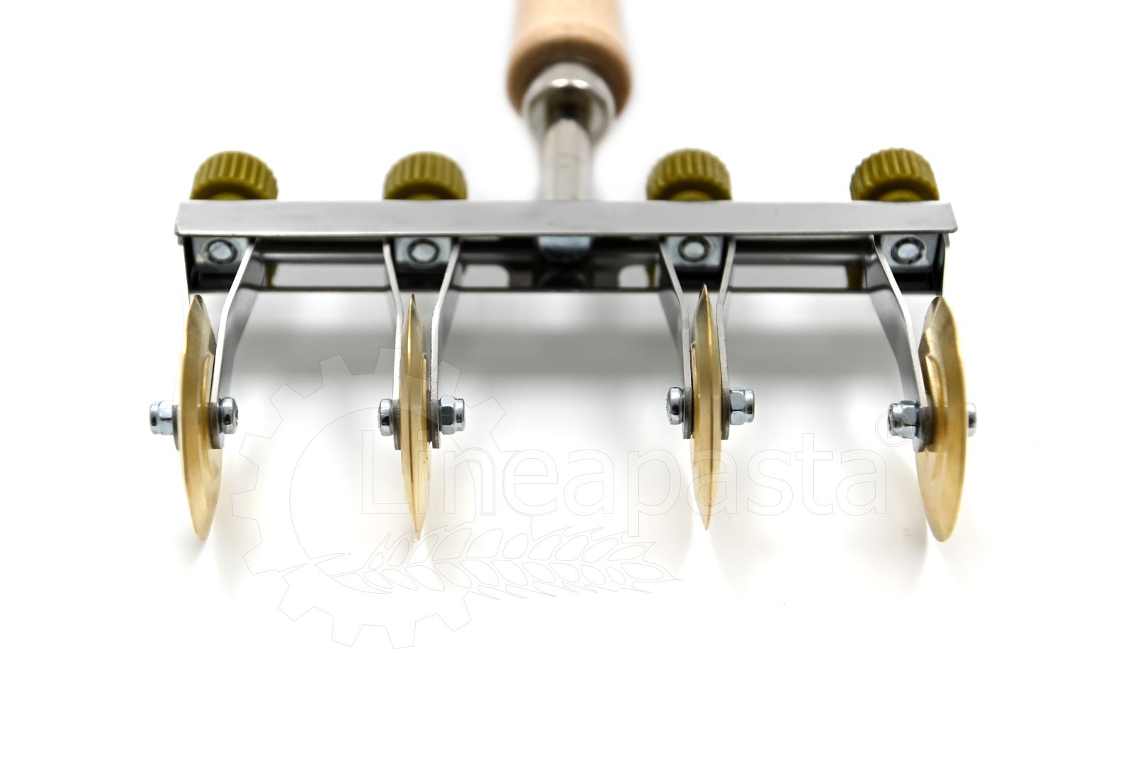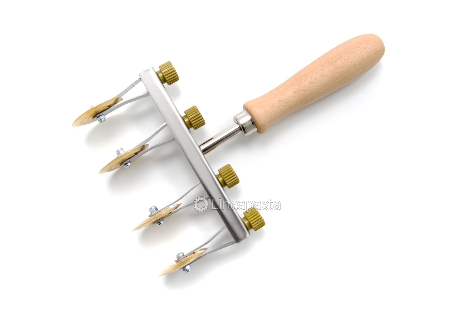 Tagliapasta a rotelle multiple composto da un pratico manico in legno, una struttura in acciaio e quattro lame lisce in ottone di diametro 38 mm. Il tagliapasta permette un taglio netto e pulito della sfoglia, è adatto sia ad uso domestico che professionale. Le 4 lame lisce in ottone sono regolabili a una distanza da 22 a 116 mm, ideali per la realizzazione di ravioli, tortelloni e tortellini.